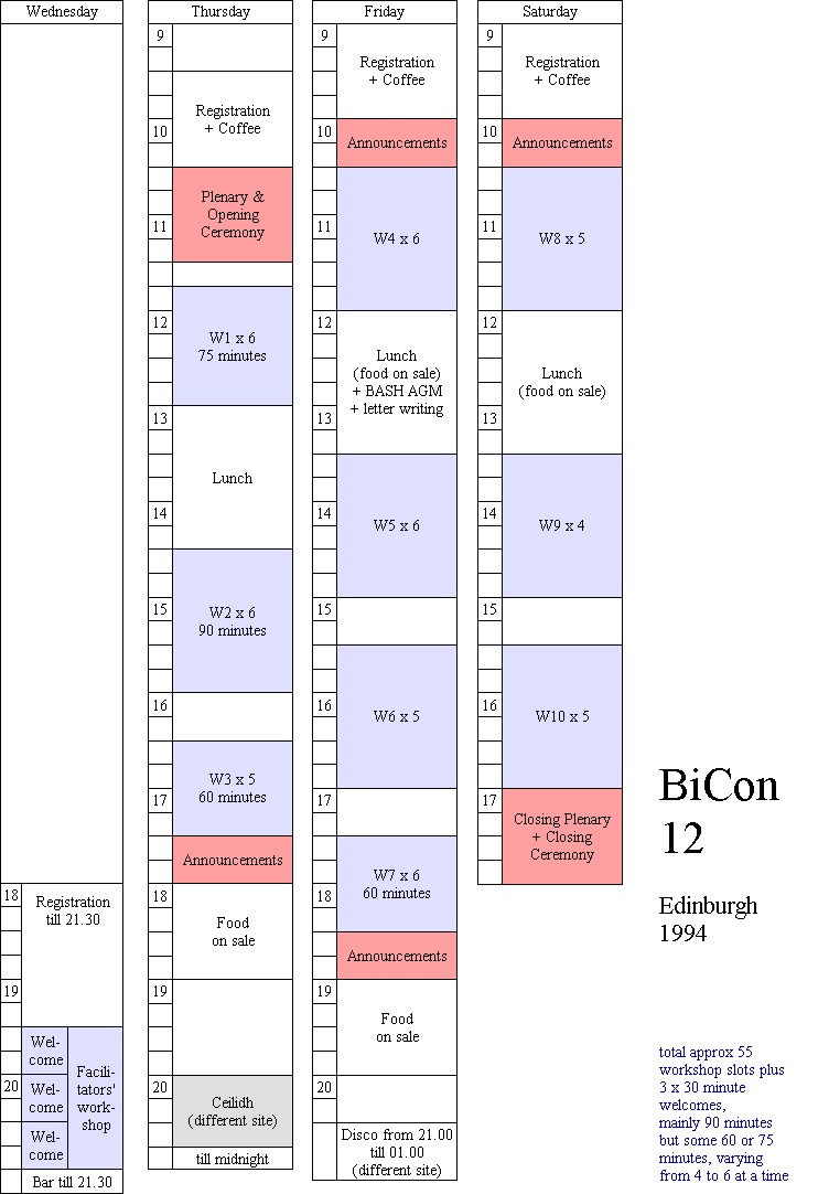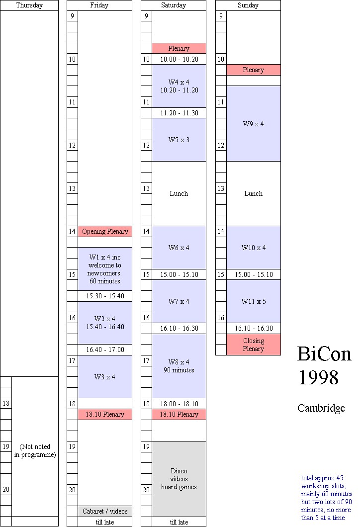 In the run-up to BiCon 2005, I was keen to get my head around the variables in BiCon timetabling, and its history, so as to learn from the past and not "reinvent the wheel". I looked through the programmes for the BiCons I'd been to, and borrowed a couple of older programmes as well.