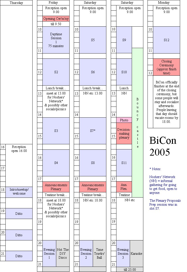 Having mulled over those structures, and my memories of the BiCons they represent, I did a similar pic showing my ideas for 2005. We did change it slightly (my original draft had the closing ceremony after lunch, with an additional workshop session on the last morning), but most of it survived to become the BiCon 2005 timetable, shown here in a similar format for comparison (181k).