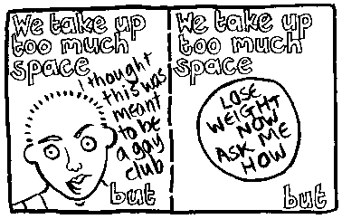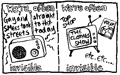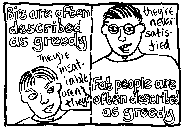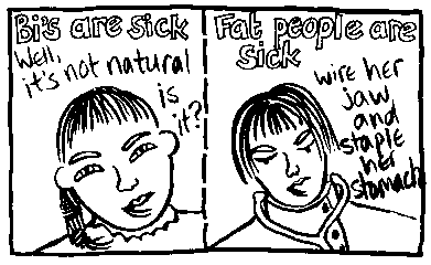 Rachael House is a famous bi cartoonist. Here is just one of her wonderful cartoons. If you want to see more then you can email her at redhankypanky@btinternet.com and find out about buying glorious zine "Red Hanky Panky" via snail mail.